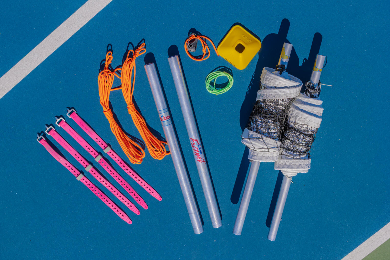 The Tizbee Friznet™ is an auxiliary net system designed for use on standard tennis courts to play the sport of Tizbee.It mounts above an existing tennis net to create a regulation 9-inch scoring gap known as the zlit, enabling competitive, precision-based disc play.
